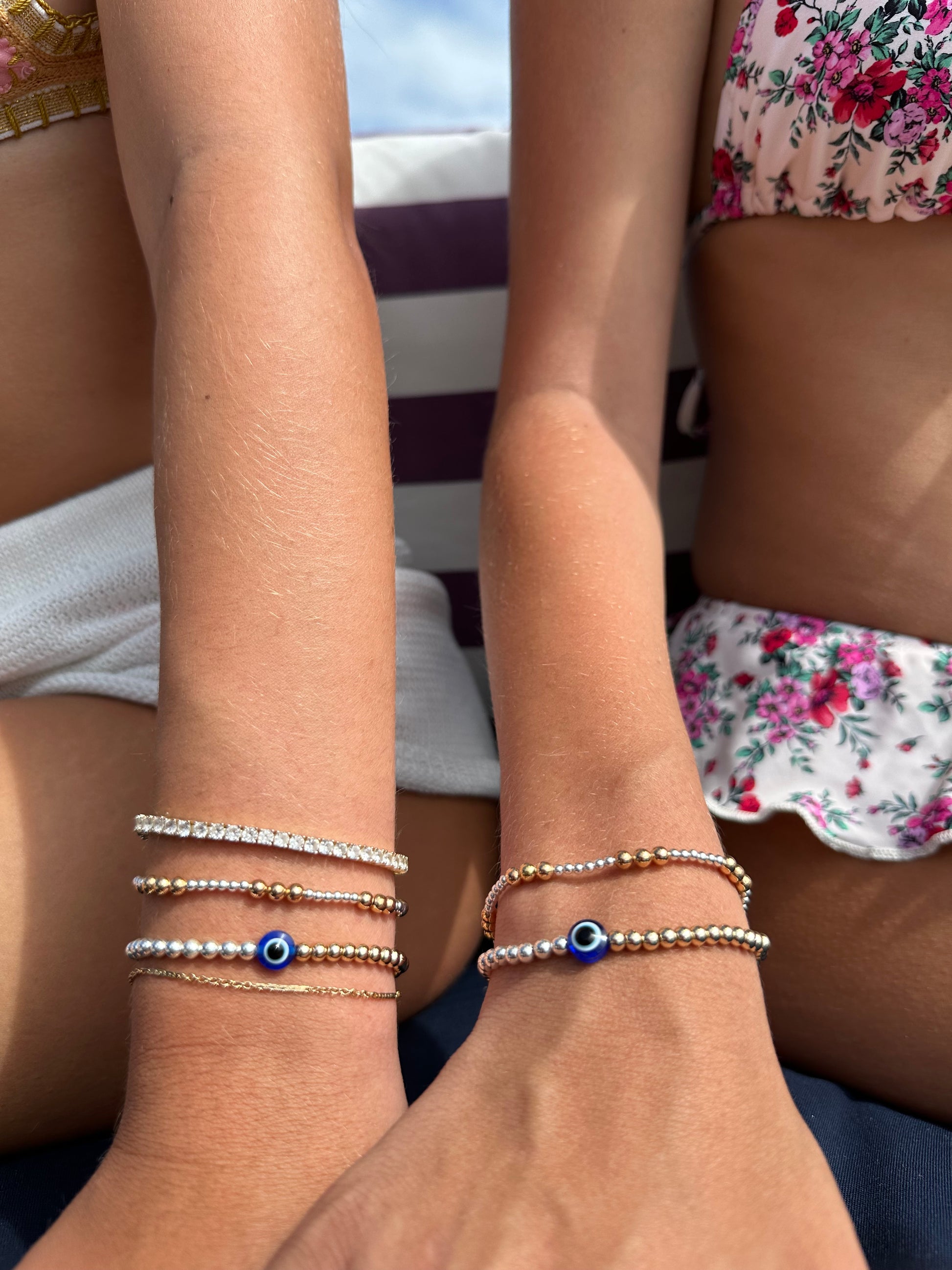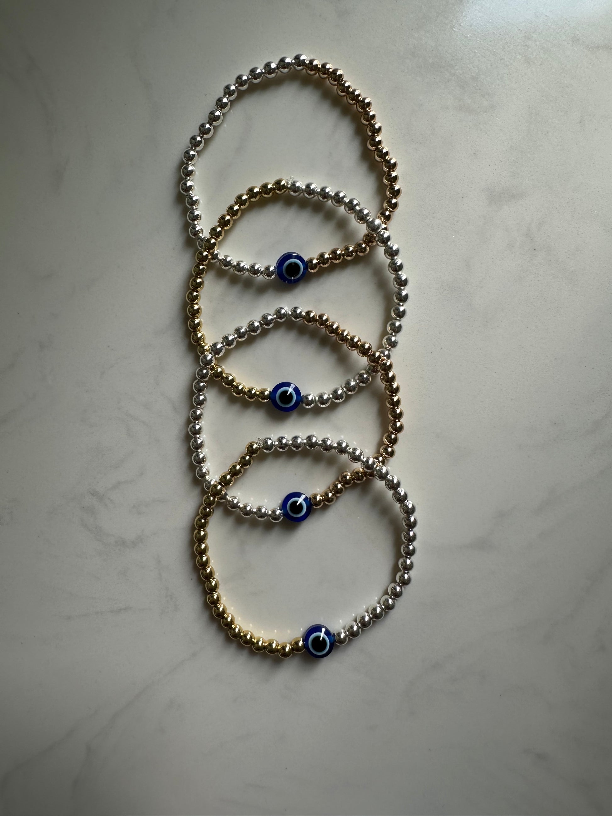 The Ventura Bracelet features a sophisticated blend of half 14k silver-filled beads and half 14k gold-filled beads, creating a striking two-tone design. At its center, a royal blue evil eye charm offers both style and symbolic protection. Crafted with a stretchy band, this bracelet comfortably fits all wrist sizes, combining elegance with versatility for everyday wear.